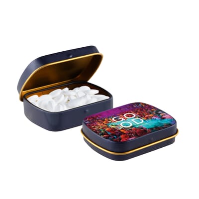 Discover the ultimate refreshing delight with our well-known mini hinge tin personalised through full-colour printing! Filled with the most tempting Dutch peppermint, this small tin is the perfect item on the go, at the office or just for a quick refreshment. Choose from many available colours.