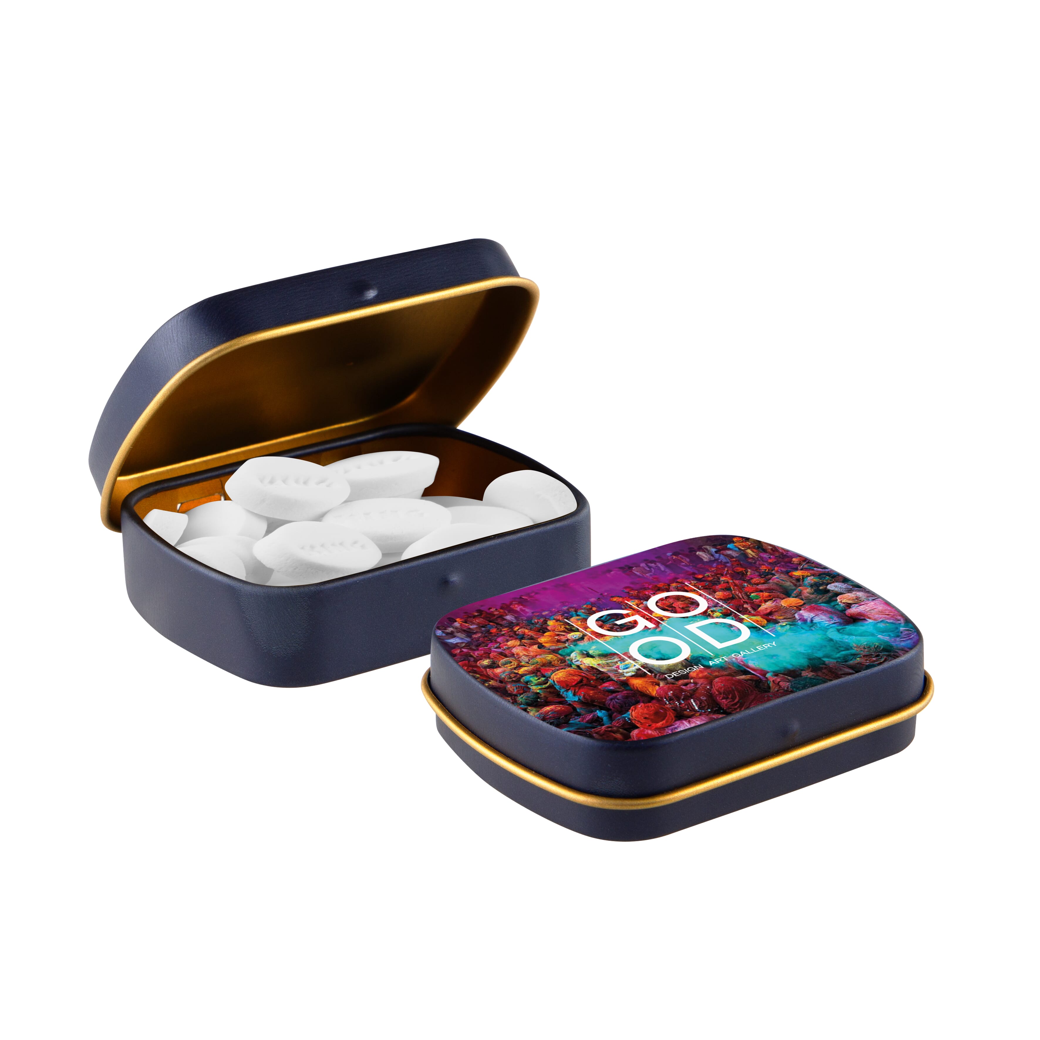 Discover the ultimate refreshing delight with our well-known mini hinge tin personalised through full-colour printing! Filled with the most tempting Dutch peppermint, this small tin is the perfect item on the go, at the office or just for a quick refreshment. Choose from many available colours.
