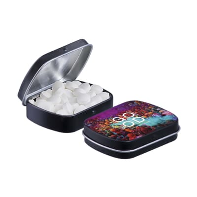 Mini scharnierblikje mat zwart met ca. 23 gram Druivensuiker mint bolletjes en voorzien van een full colour bedrukking. Inclusief ingrediëntensticker en seal.