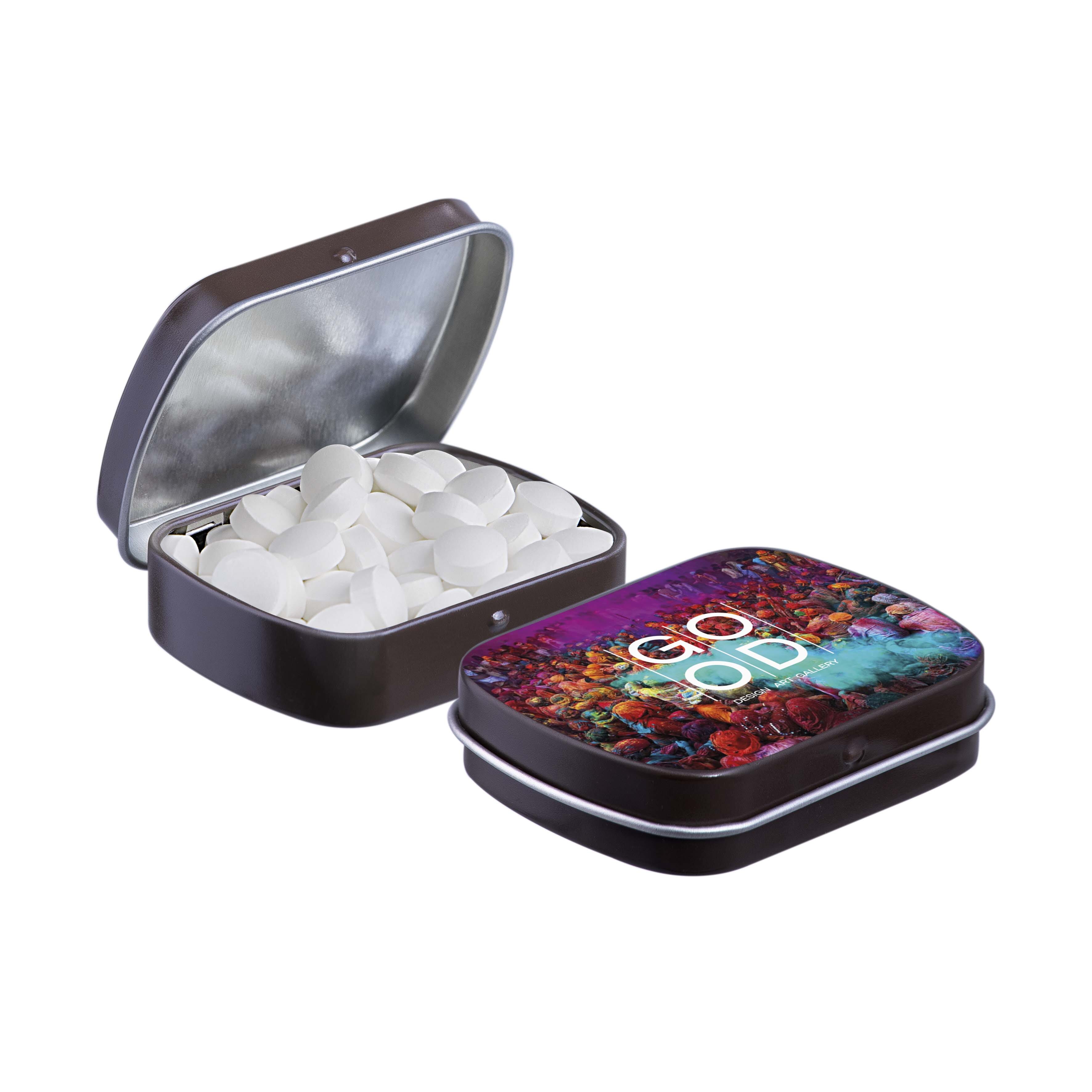 Mini scharnierblikje bruin met ca. 23 gram Druivensuiker mint bolletjes en voorzien van een full colour bedrukking. Inclusief ingrediëntensticker en seal.