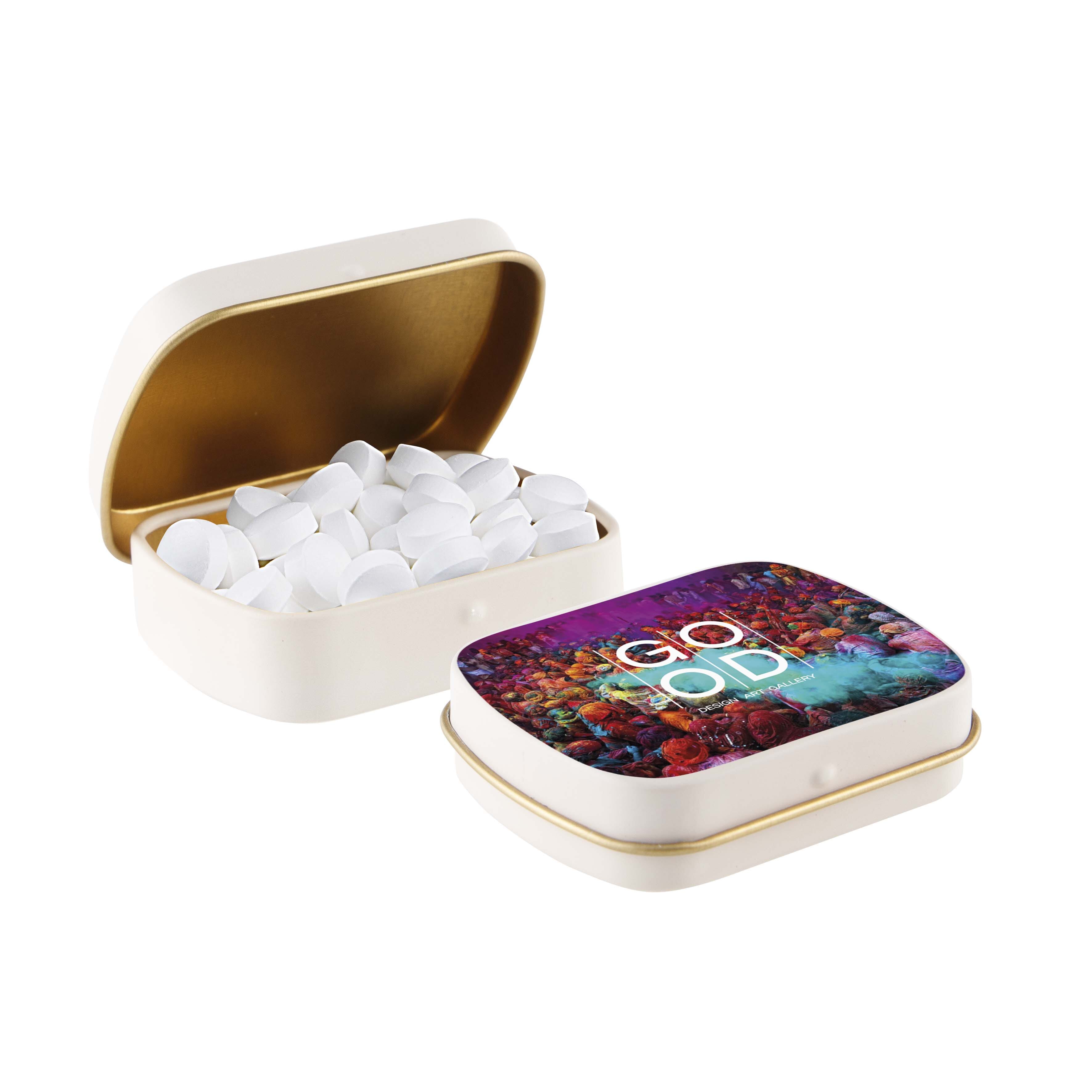 Mini scharnierblikje mat zand met gouden binnenkant en ca. 23 gram Druivensuiker mint bolletjes. Voorzien van een full colour bedrukking en inclusief ingrediëntensticker en seal.