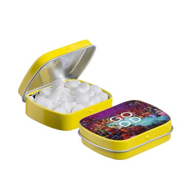 Mini scharnierblikje geel met ca. 23 gram Druivensuiker mint bolletjes en voorzien van een full colour bedrukking. Inclusief ingrediëntensticker en seal.