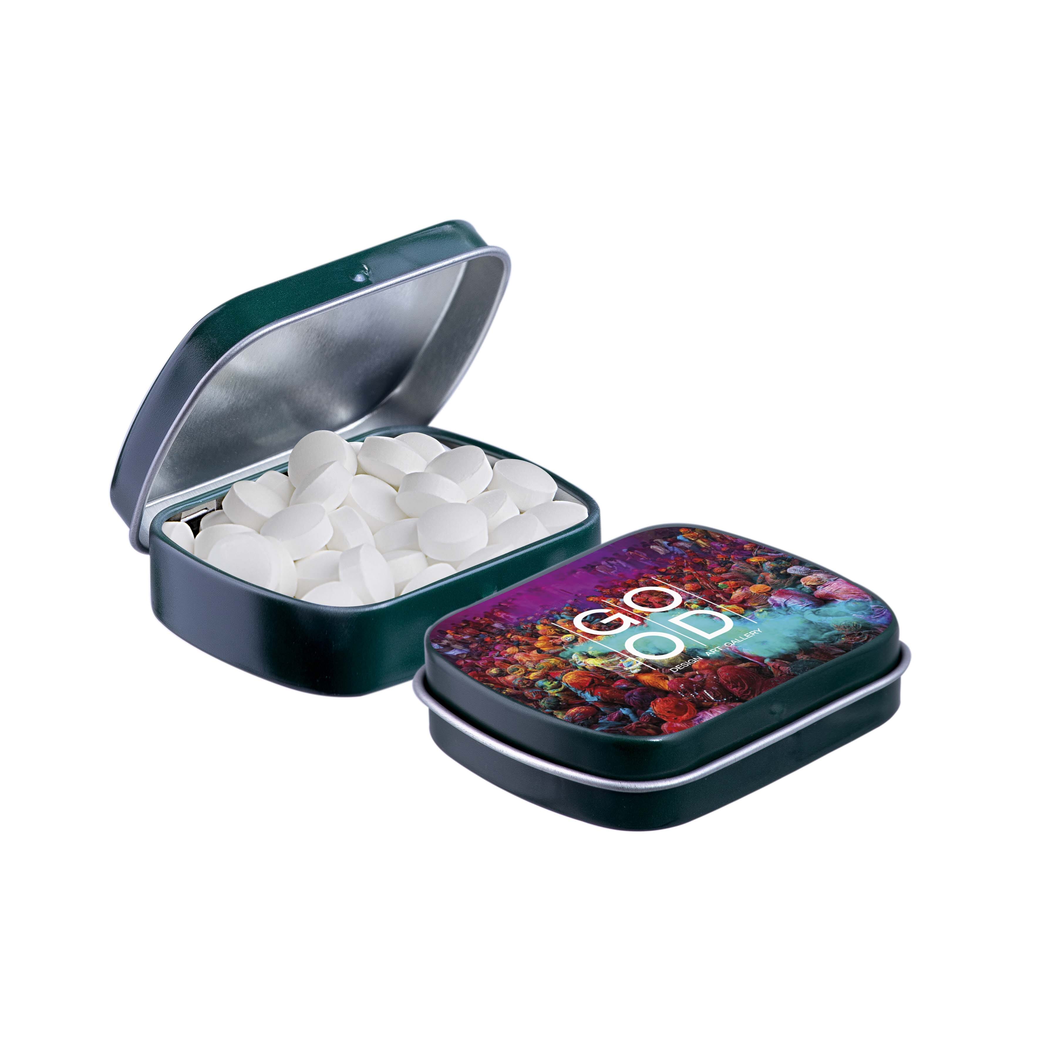 Mini scharnierblikje donkergroen met ca. 23 gram Druivensuiker mint bolletjes en voorzien van een full colour bedrukking. Inclusief ingrediëntensticker en seal.
