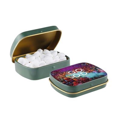 Mini scharnierblikje mat groen met gouden binnenkant en ca. 23 gram Druivensuiker mint bolletjes. Voorzien van een full colour bedrukking en inclusief ingrediëntensticker en seal.