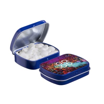 Mini scharnierblikje blauw met ca. 23 gram Druivensuiker mint bolletjes en voorzien van een full colour bedrukking. Inclusief ingrediëntensticker en seal.