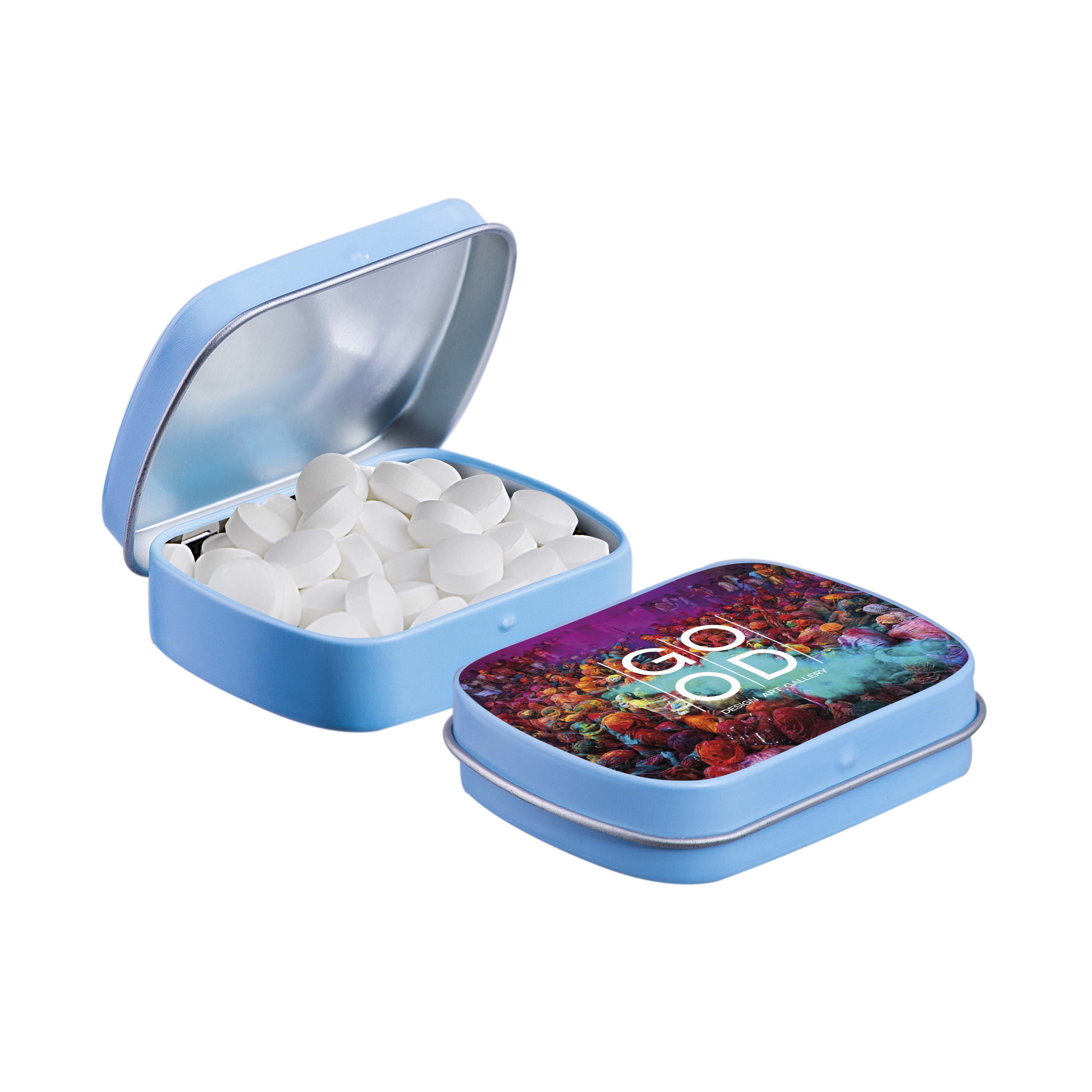 Mini scharnierblikje lichtblauw met ca. 23 gram Druivensuiker mint bolletjes en voorzien van een full colour bedrukking. Inclusief ingrediëntensticker en seal.