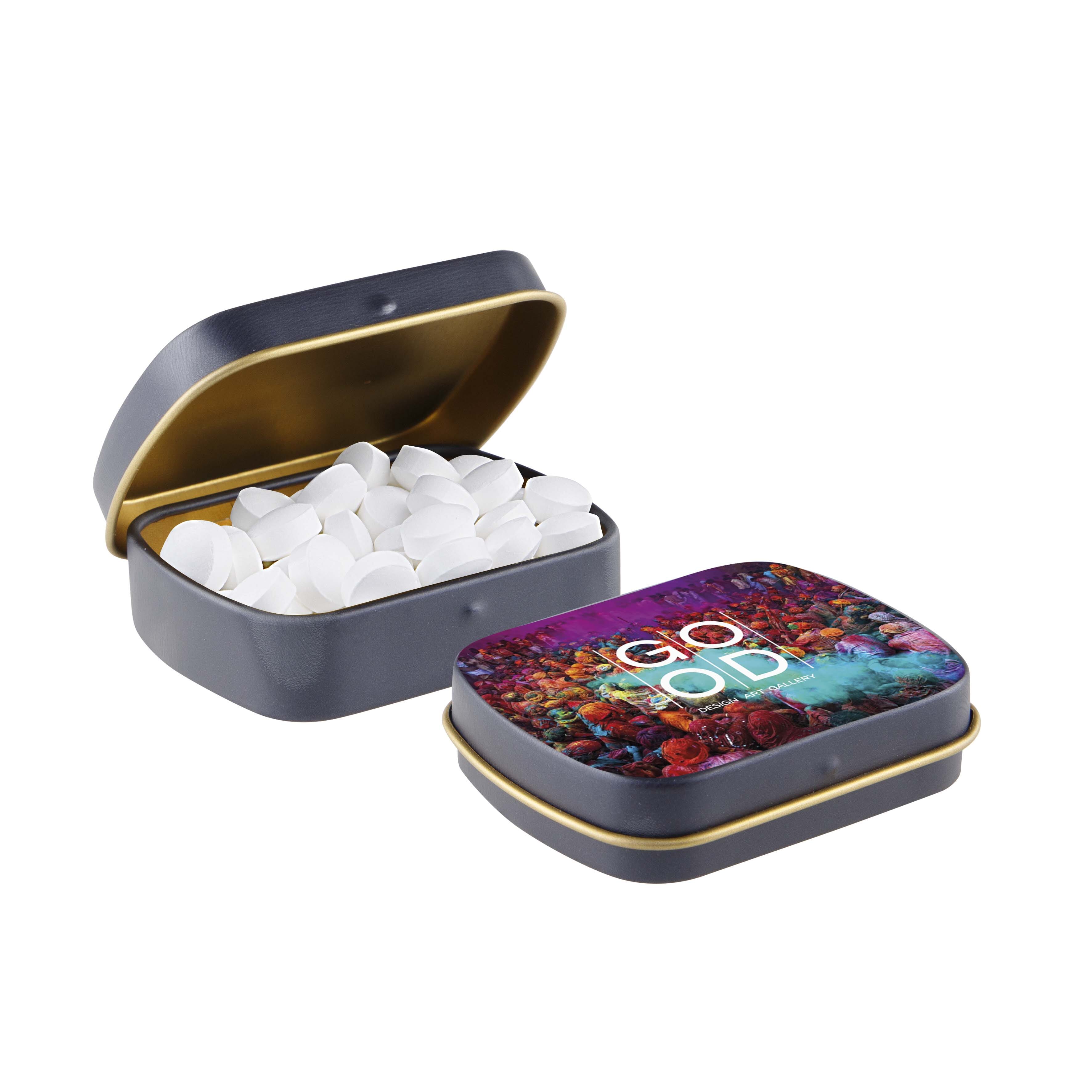 Mini scharnierblikje mat donkerblauw met gouden binnenkant en ca. 23 gram Druivensuiker mint bolletjes. Voorzien van een full colour bedrukking en inclusief ingrediëntensticker en seal.
