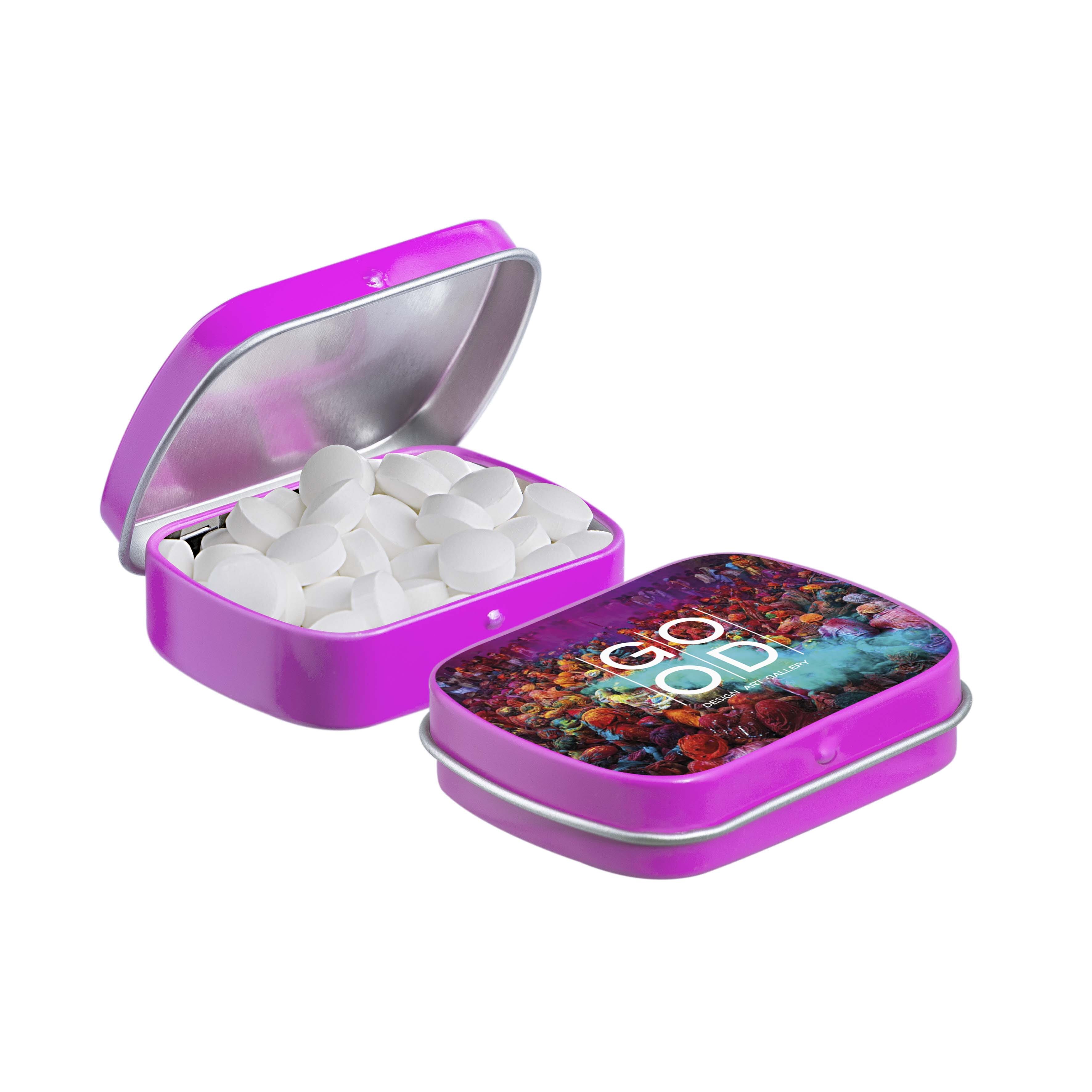 Mini scharnierblikje fuchsia met ca. 23 gram Druivensuiker mint bolletjes en voorzien van een full colour bedrukking. Inclusief ingrediëntensticker en seal.