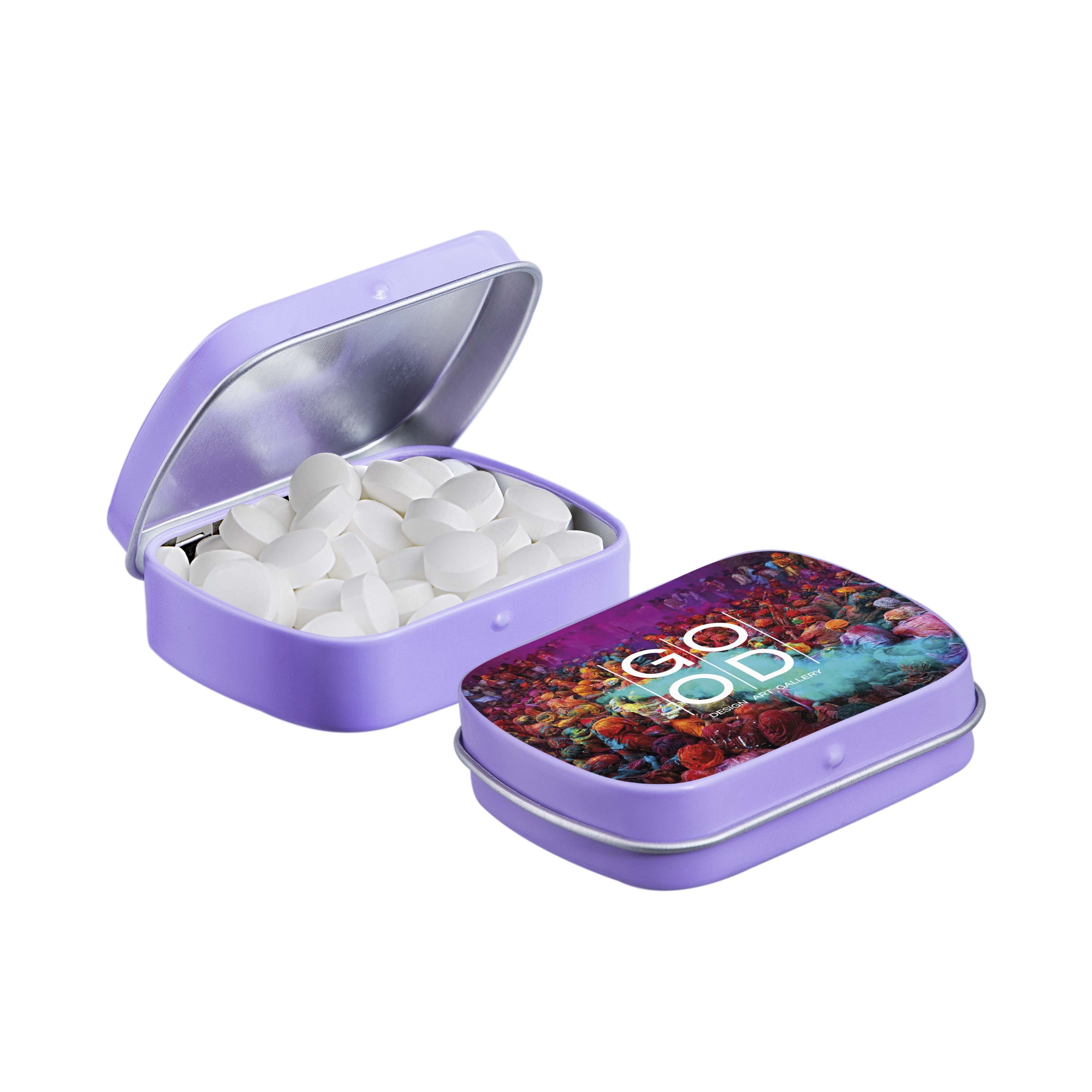Mini scharnierblikje lila met ca. 23 gram Druivensuiker mint bolletjes en voorzien van een full colour bedrukking. Inclusief ingrediëntensticker en seal.